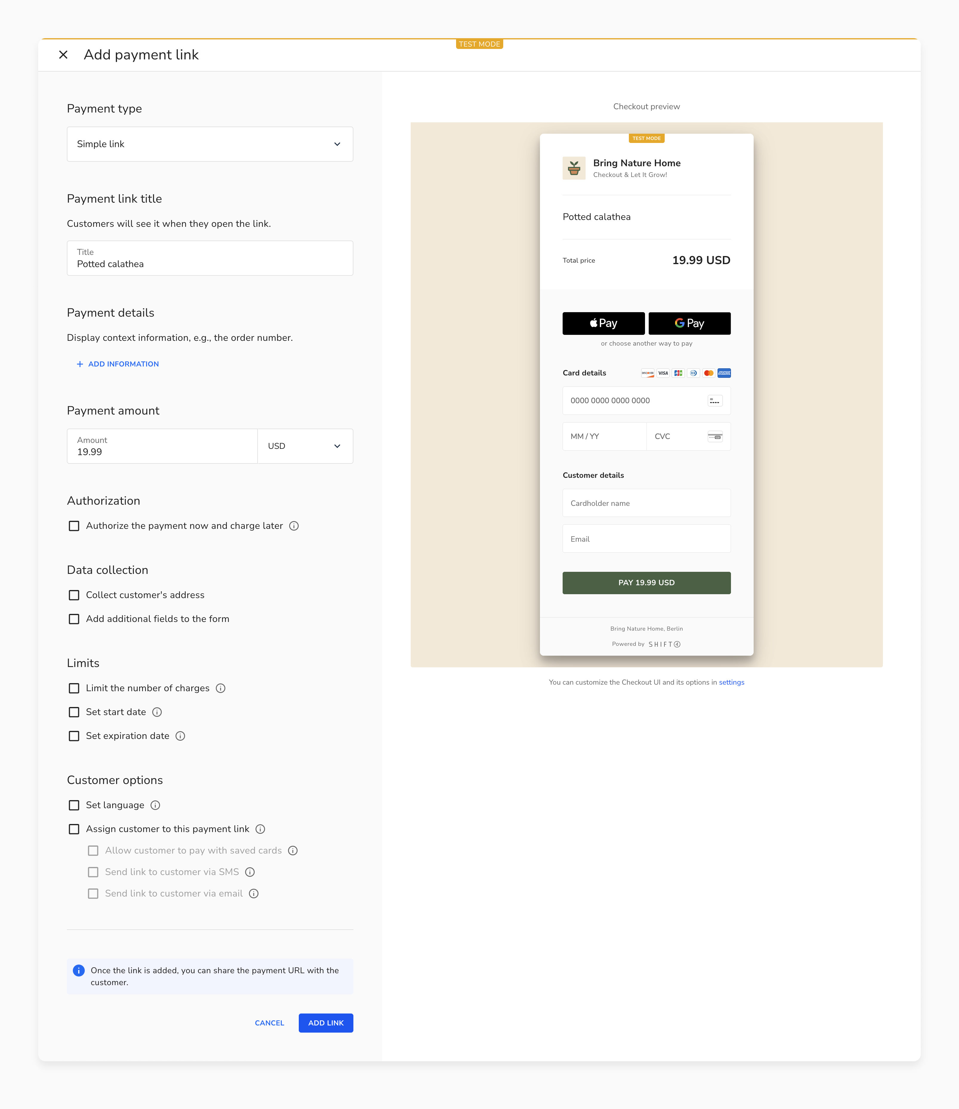 Single link requires specifying amount, currency and payment title. On the right side of the modal you will see a preview of the checkout